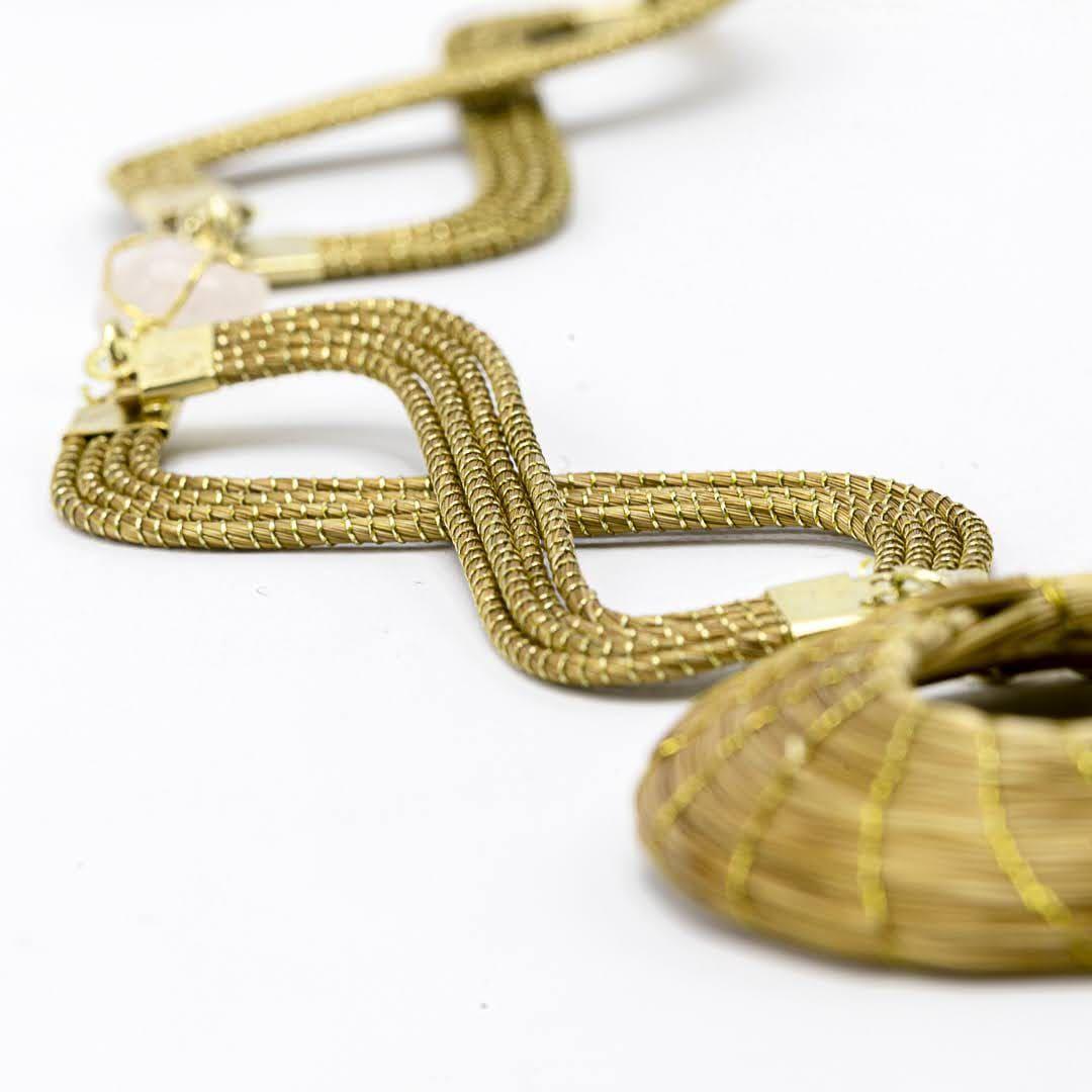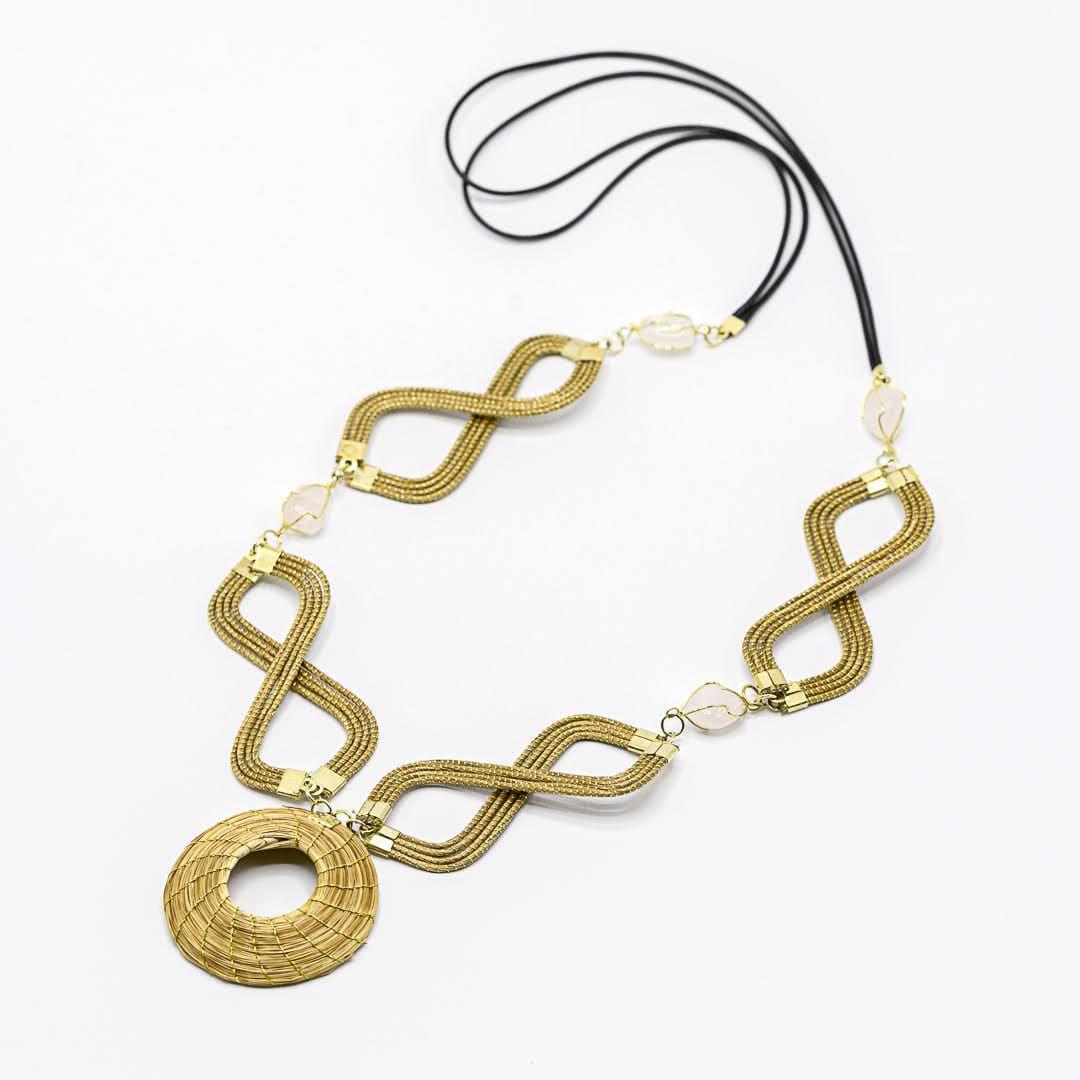 Collar largo con detalles en cestería con piedra de quartzo rosa